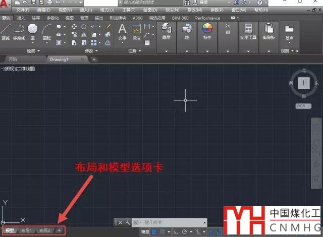 在CAD中新建一張空圖,就可以看到底部有一個標簽欄,分別寫著“模型(Model)”和“布局(Layout)”,如下圖所示。