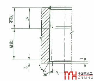 另外,為了避免先焊后脹時,脹接對焊縫的影響(如產(chǎn)生裂紋),如下面兩個圖所示GB/T151均要求深度脹,即脹接部位離焊縫至少15mm。