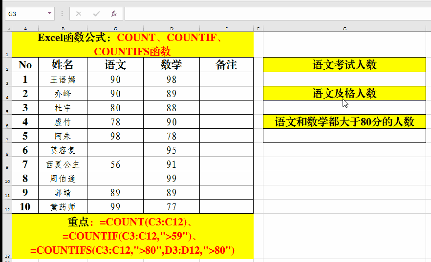 示例公式:=COUNTIFS(C3:C12,">80",D3:D12,">80")