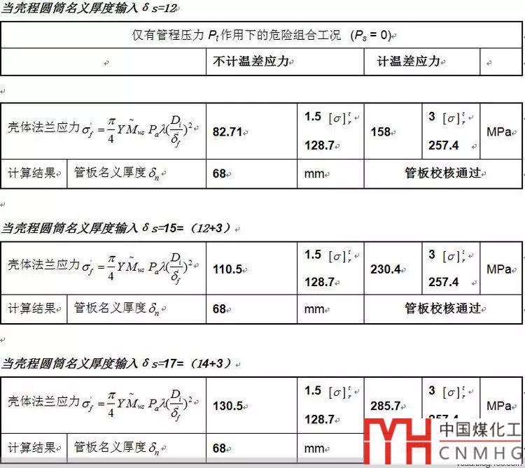 某項目中一臺臥式固定管板式換熱器,其殼程介質(zhì)需要選用不銹鋼,即管板、換熱管材質(zhì)為S30403/022Cr19Ni10,殼程殼體材料選用(12+3)mm不銹鋼復合板Q345R+S30403,管板厚度68mm;以此進行設(shè)計校核。按常規(guī)通行的計算程式SW-6中輸入殼程圓筒δs=12,計算結(jié)果通過。此次反映在計算頁中的殼體法蘭應(yīng)力值σf 不大,為許用值61%。