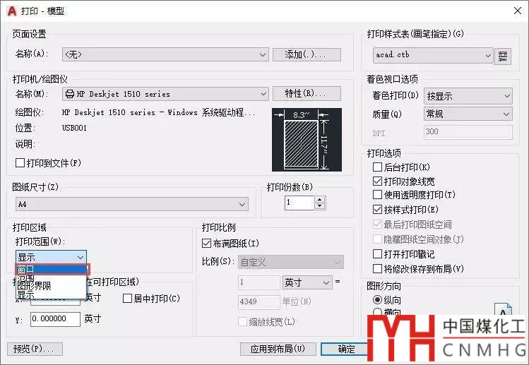 也就是我們要打印的圖面區(qū)域,默認(rèn)選項(xiàng)是顯示,也就是當(dāng)前圖形窗口顯示的內(nèi)容,我們還可以設(shè)置為窗口、范圍(所有圖形)、圖形界限(LIMITS設(shè)置的的范圍。如果切換到布局的話,圖形界限選項(xiàng)會(huì)變成布局。窗口是比較常用的方式。