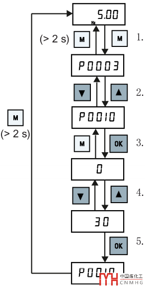 下面的操作示例是將參數(shù)P0010的值設(shè)置為30,以便變頻器恢復(fù)出廠默認(rèn)設(shè)置值: