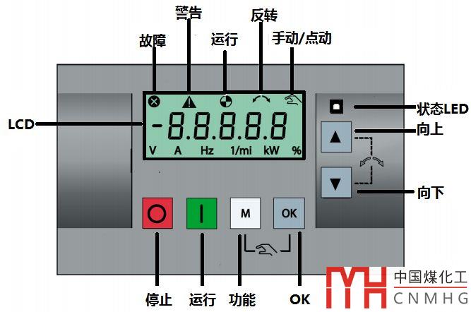 基本操作面板的LCD顯示屏可以顯示故障、警告、運(yùn)行等信息及變頻器的菜單。