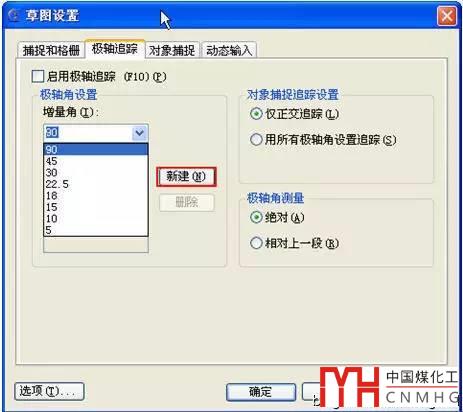 極軸非常簡單,使用的關(guān)鍵就是合理的設(shè)置極軸增量角,軟件提供了一系列常用的增量角設(shè)置,可以直接在下拉列表中選取,如果有特殊需要,也可以自己添加增量角。在底部狀態(tài)的極軸追蹤按鈕上右鍵,就可以彈出極軸的相關(guān)設(shè)置對話框,如下圖所示。