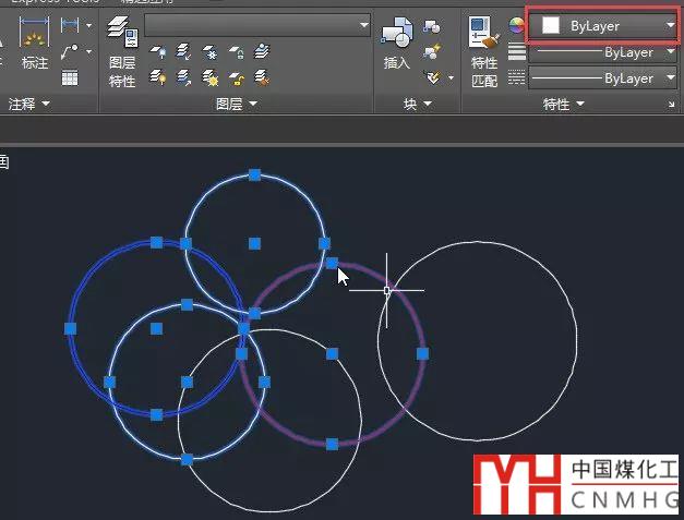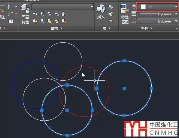 我們不妨來通過一個簡單的實例來看一下他的問題,我這里設置了3個不同顏色的圖層,0層是白色的,大部分圖形的顏色是隨層的,0層和圖層1上分別有一個圓單獨設置成了白色,我們看看將快速選擇條件設置成白色和隨層的選擇結(jié)果。
