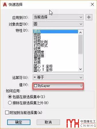 重新打開快速選擇,將顏色設置為等于Bylayer,如下圖所示。