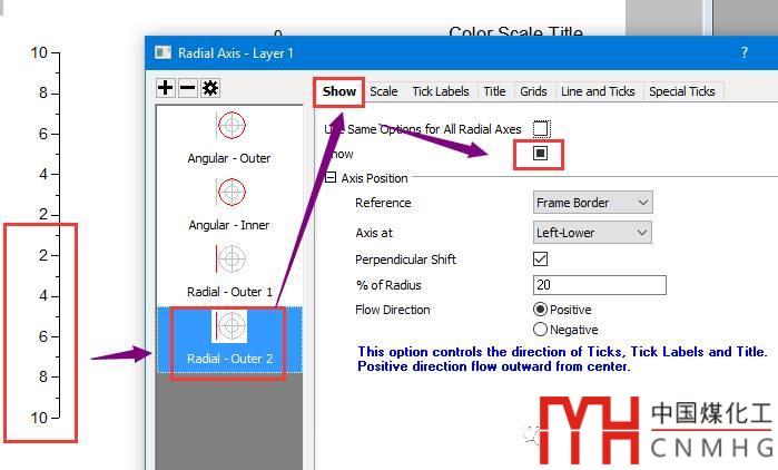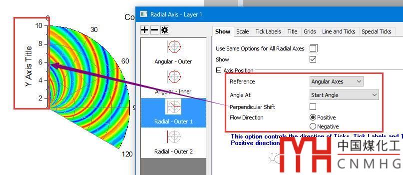 切換到Raidial-Outer 1坐標(biāo)軸中Show標(biāo)簽頁,修改Axis Position下的各個(gè)選項(xiàng),將半徑坐標(biāo)軸放在角度坐標(biāo)開始的位置。