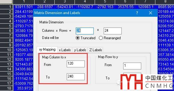 所用Matrix格式數(shù)據(jù)的示例,其中x表示的是角度坐標(biāo)(Angular, θ),y表示的是半徑坐標(biāo)(Radial, r)。設(shè)置x的取值范圍,可以調(diào)整Polar Contour圖的角度坐標(biāo)范圍,后面會(huì)詳細(xì)介紹。