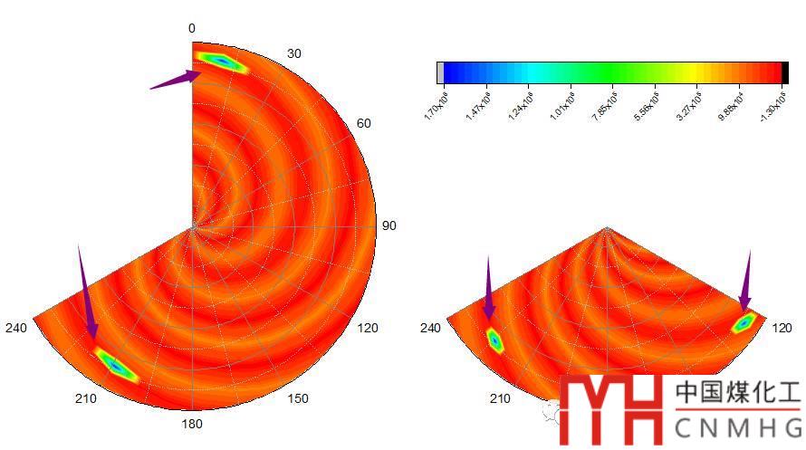 不同夾角的扇形圖形所表示的數(shù)據(jù)的絕對位置與取值是不變的。比如我們將Matrix中加入兩個(gè)特別突出的數(shù)值點(diǎn),兩點(diǎn)之間的相對關(guān)系在不同夾角的Polar Contour圖中是一樣的。