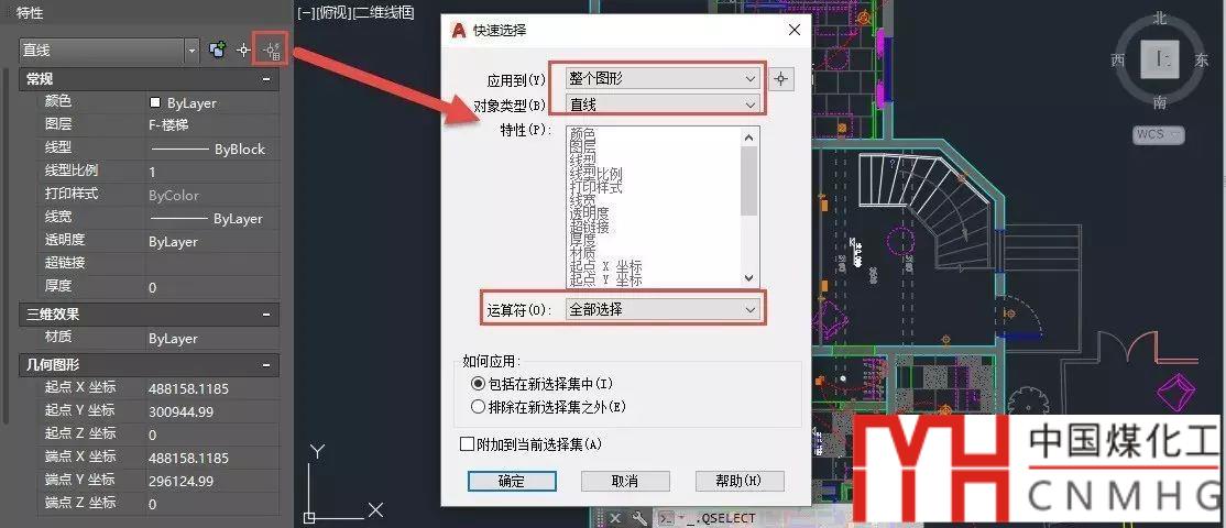 輸入QSELECT命令后回車或直接在特性面板中單擊快速選擇按鈕,打開快速選擇對話框,選擇應(yīng)用到整個圖形,在對象類型中選擇直線,在運(yùn)算符里選擇“選擇全部”,單擊"確定"按鈕,將所有直線選擇出來。