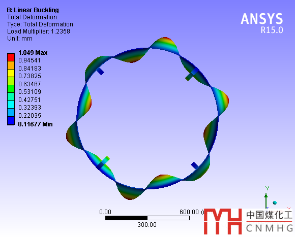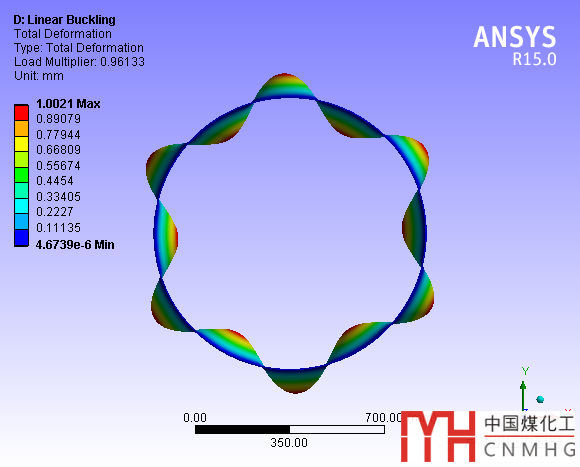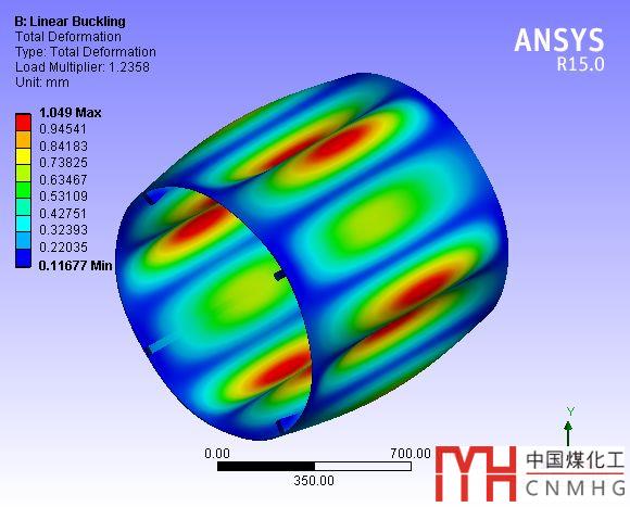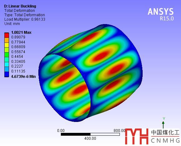 我們首先對(duì)不帶肋的圓筒進(jìn)行WB分析,結(jié)果如下圖所示,其臨界失穩(wěn)壓力Pcr=0.961MPa,[P]=0.320,與水槽公式非常接近。