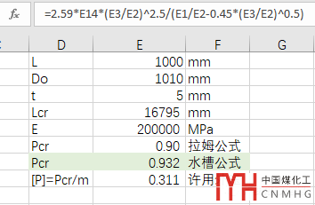 圓筒的參數(shù),及由美國(guó)海軍水槽試驗(yàn)公式計(jì)算得到的臨界失穩(wěn)壓力Pcr,如上圖所示。其中,安全系數(shù)m=3。