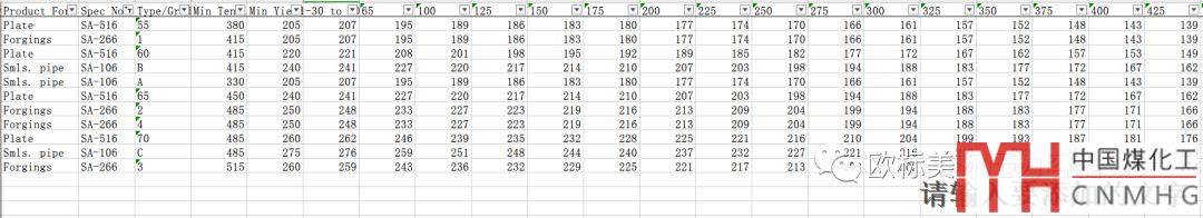 接正文,又抽點時間把ASME II卷D篇的許用應力和高溫屈服強度(因為II卷D篇截圖會很亂所以沒有直接到標準上截圖,用compress軟件導出的材料庫匯總中截圖)截圖,把GB/T 150.2的碳鋼板材,管材,鍛件的許用應力和高溫屈服強度截圖(為了看的更清楚,截圖用的報批稿沒仔細核對是否和印刷版有出入)。把碳鋼材料的截圖方便直接對比。截圖了板材SA-516,管材SA-106,鍛件SA-266。由于普通碳鋼小鍛件SA-105和換熱管SA-179沒有選擇余地所以沒有放一起截圖。把SA-105和SA-179的許用應力和屈服強度單獨截圖了