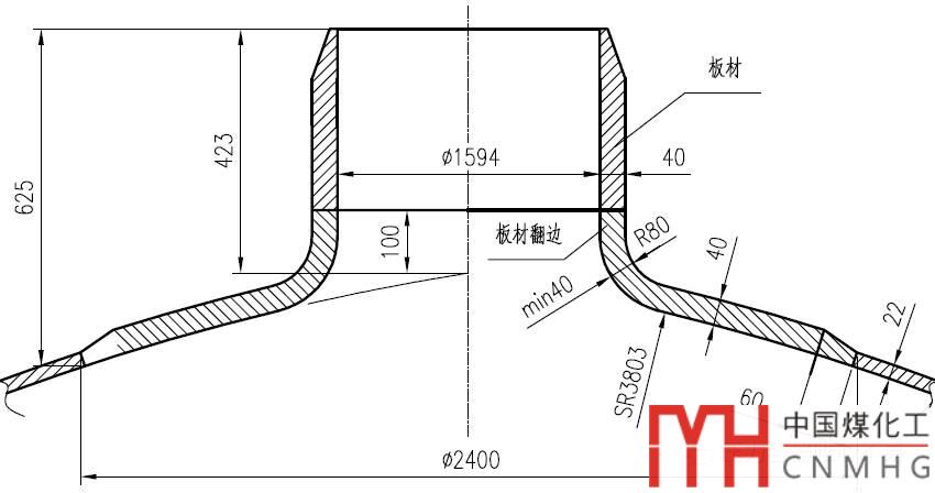 采用板材翻邊結(jié)構(gòu),然后再用板材焊接的筒節(jié)與之焊接。局部加厚封頭。