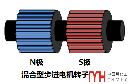 顧名思義,混合式步進(jìn)電機(jī)結(jié)合了永磁式和反應(yīng)式步進(jìn)電機(jī)的優(yōu)點(diǎn),它的轉(zhuǎn)子采用永磁性材料,并且將其分成南極(S極)和北極(N極)兩個(gè)部分,每個(gè)部分又有很多的齒狀結(jié)構(gòu),如下圖所示: