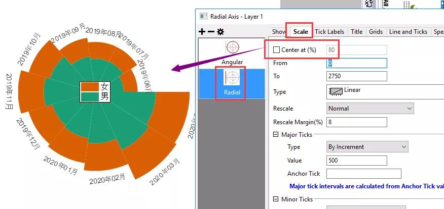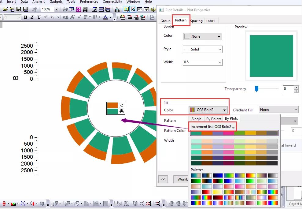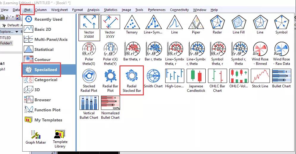 Plot菜單中選取相應(yīng)的模板,此處選擇Specialized類目下的Radial Stacked Bar類型的圖形。