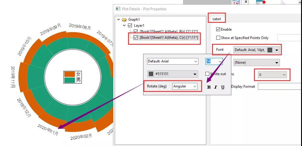 Label頁(yè)面,選中數(shù)據(jù)列中的最后一個(gè)數(shù)據(jù)列(目的是將標(biāo)簽顯示在最外側(cè)),將Label from選為X,打開(kāi)Font下來(lái)箭頭,將Rotate選為Angular,即按角度方向分布。