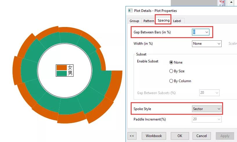 Spacing頁(yè)面,將Gap Between Bars設(shè)為0,Spoke Style設(shè)為Sector,即扇形。