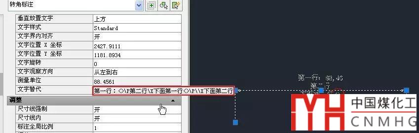 例如我們可以選中一個(gè)標(biāo)注,在特性面板(CTRL+1)中文字替代欄中輸入下面的文字:“第一行:<>P第二行X下面第一行<>PX下面第二行”,然后看看寫(xiě)出來(lái)的效果,對(duì)上面所說(shuō)的就清楚了,我們可以看到后面第二次輸入的<>和X保留了原來(lái)的字符,沒(méi)有起任何作用。