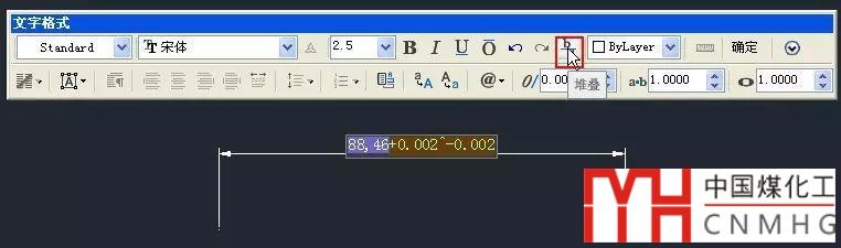 編輯標(biāo)注文字時(shí)可以使用多行文字編輯器的大部分功能,如回車(chē)換行、插入字段、設(shè)置上下劃線(xiàn)等,還可以利用多行文字堆疊來(lái)寫(xiě)公差。比如上面的標(biāo)注,我們可以在后面加上+0.002^-0.002,選中這些添加的文字,單擊多行文字編輯中的堆疊按鈕就可以得到公差的效果,如下圖所示。