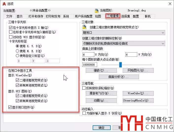 這個工具其實分為兩部分,一是上面用于調(diào)整視圖方向的方塊,一個是下面用于調(diào)整坐標系的下拉菜單。在選項對話框中,針對不同視覺樣式設置了空間是否顯示的參數(shù),之所以有不少人找不到選項,是因為這個選項不在“顯示”選項卡中,而是在選項OP對話框的“三維建模”選項卡中,如下圖所示。