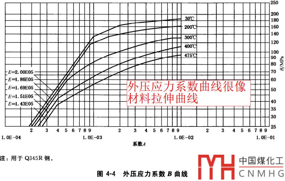 B值為應(yīng)力系數(shù),為2倍環(huán)向應(yīng)力。A與B是應(yīng)變應(yīng)力關(guān)系,所以從規(guī)范上的外壓應(yīng)力系數(shù)B曲線圖上看,非常像鋼材的拉伸曲線。