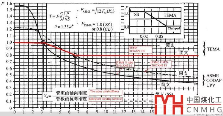 有學(xué)者通過(guò)觀察兩者公式的差別,兩者的公式基本類(lèi)似,來(lái)源于圓平板公式,只是TEMA的系數(shù)F是簡(jiǎn)單的折線關(guān)系,見(jiàn)下圖的紅線。ASME的F是與Xa相關(guān)的一個(gè)系數(shù),是一個(gè)曲線。