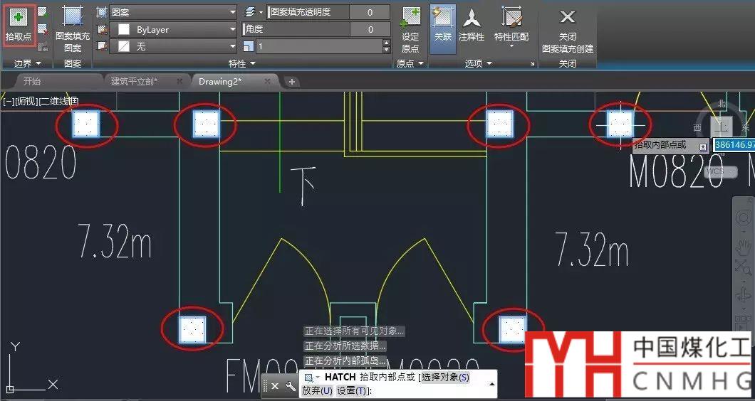 2、輸入H,回車(chē),單擊“拾取點(diǎn)”按鈕,依次在幾個(gè)柱子中間單擊,將所有柱子一起填充,如下圖所示。