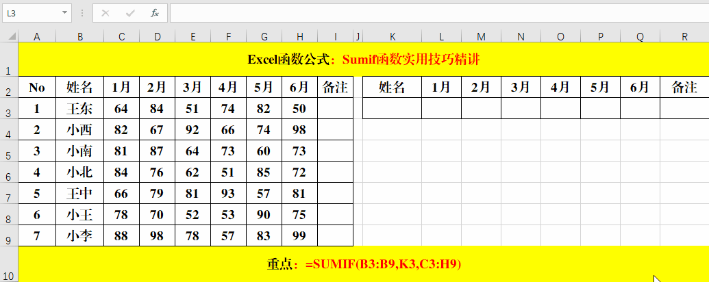 在目標(biāo)單元格中輸入公式:=SUMIF(B3:B9,K3,C3:H9)。