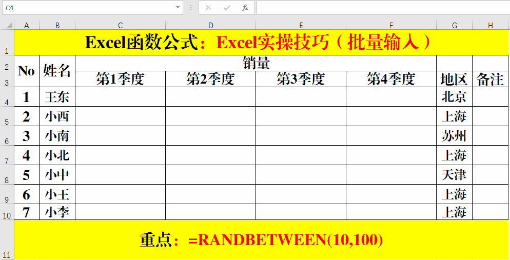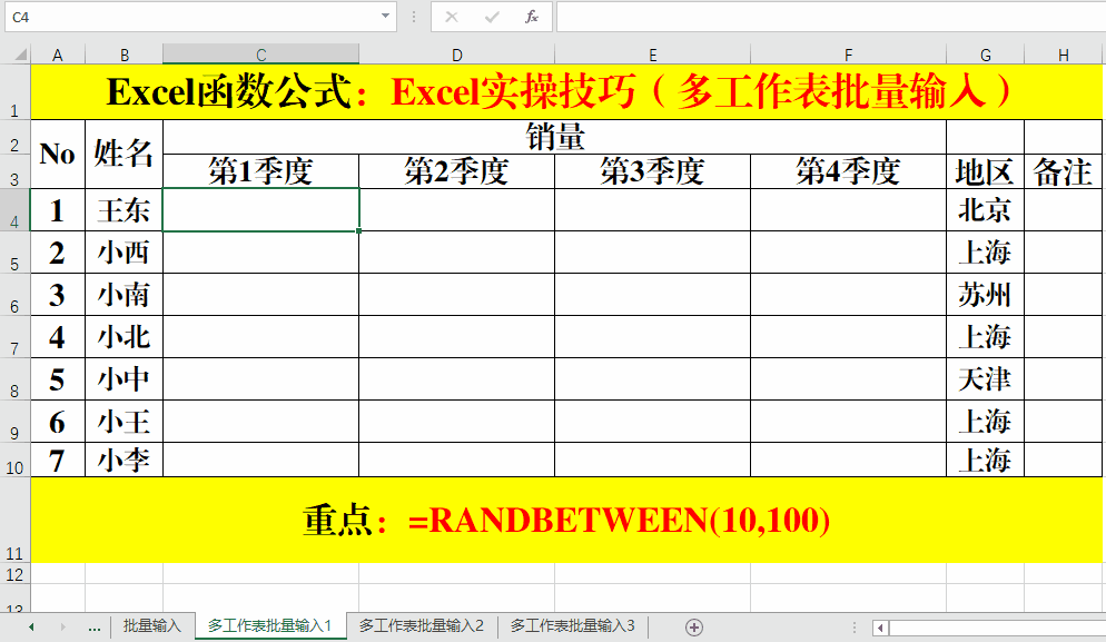 目的:在多個工作表中批量輸入演示數(shù)據(jù)或指定內容。