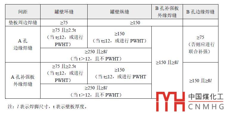 注:從表中可以看出,如果壁板厚t≤12,或者壁板開孔后進(jìn)行焊后熱處理PWHT的,標(biāo)準(zhǔn)對于焊縫間距的要求是相對較低的,要低于壁板厚度t>12,且不進(jìn)行PWHT的情況。這是因為,相對于薄板,厚板容易出現(xiàn)內(nèi)部缺陷,焊接性能也不如薄板,可參考我們之前的文章《GB/T 150關(guān)于“較厚鋼板”的規(guī)定及解析》。