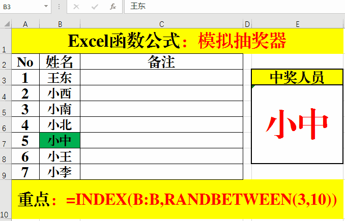 5、在目標(biāo)單元格中輸入公式:=INDEX(B:B,RANDBETWEEN(3,10))并按下F9,并隨機(jī)的松開,即可選出中獎(jiǎng)人員。