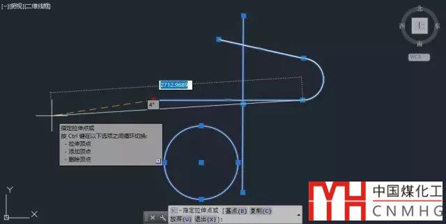 提示告訴我們選中夾點后默認執(zhí)行的是拉伸命令,可將選中的夾點移動到新的位置??梢酝ㄟ^光標或坐標輸入來定位夾點的新位置,也可以用光標確定方向,直接輸入拉伸的距離。