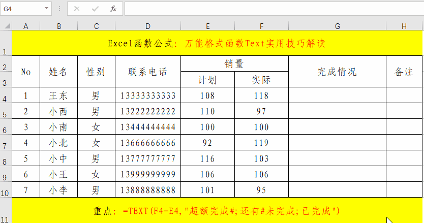 在目標單元格中輸入公式:=TEXT(F4-E4,"超額完成#;還有#未完成;已完成")。