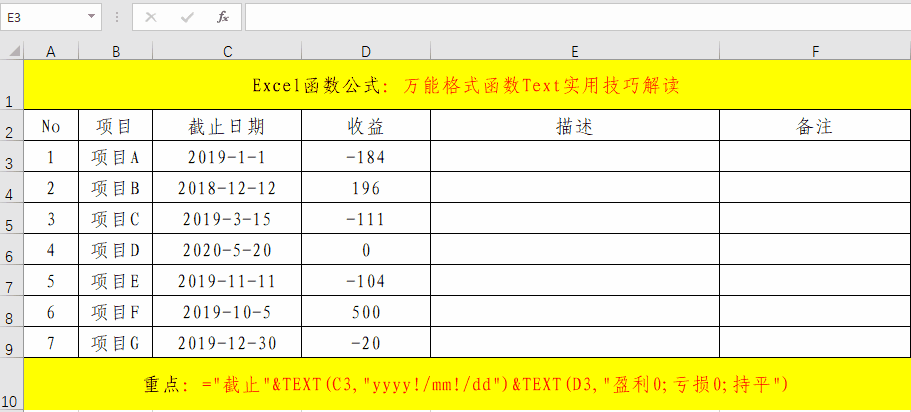 在目標單元格中輸入公式:="截止"&TEXT(C3,"yyyy!/mm!/dd")&TEXT(D3,"盈利0;虧損0;持平")。