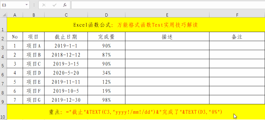 在目標單元格中輸入公式:="截止"&TEXT(C3,"yyyy!/mm!/dd")&"完成了"&TEXT(D3,"0%")。