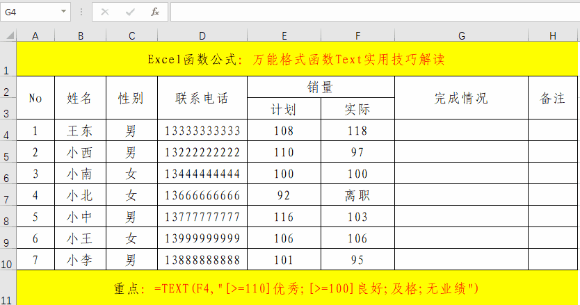 在目標單元格中輸入公式:=TEXT(F4,"[>=110]優(yōu)秀;[>=100]良好;及格;無業(yè)績")