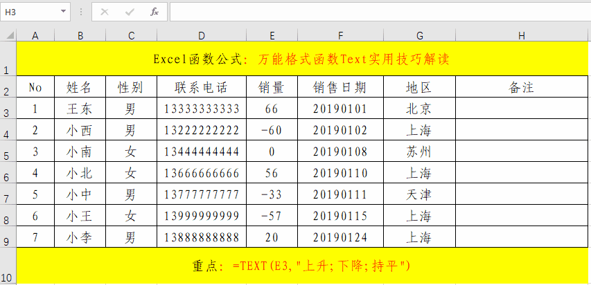 在目標單元格中輸入公式:=TEXT(E3,"上升;下降;持平")。