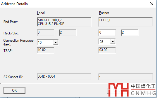 點(diǎn)擊【地址詳細(xì)信息(Address Details)】按鈕,打開對(duì)話框,將【導(dǎo)軌/槽號(hào)(Rack/Slot)】修改成通信伙伴的實(shí)際設(shè)置。S7-300的CPU一般導(dǎo)軌(Rack)為0,槽號(hào)(Slot)為2),如下圖: