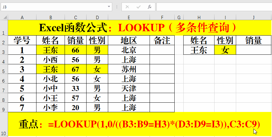 在目標(biāo)單元格輸入公式:=LOOKUP(1,0/((B3:B9=H3)*(D3:D9=I3)),C3:C9)。