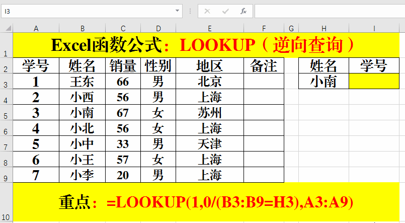在目標(biāo)單元格中輸入公式:=LOOKUP(1,0/(B3:B9=H3),A3:A9)。