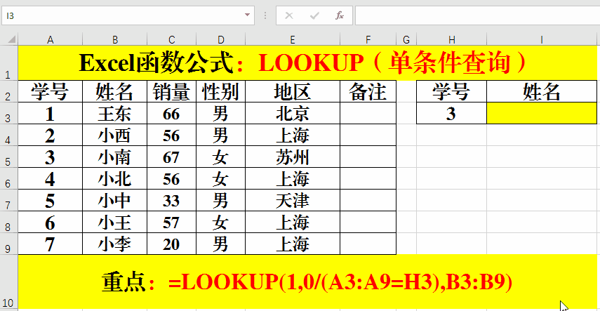 在目標(biāo)單元格中輸入公式:=LOOKUP(1,0/(A3:A9=H3),B3:B9)。