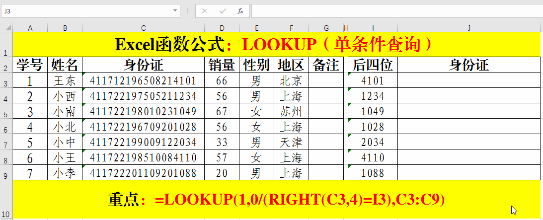 利用函數(shù)RIGHT提取身份證號(hào)的后4位,然后和單元格I3中的值比較,得到數(shù)據(jù)組,然后進(jìn)一步的對(duì)比,得出結(jié)果。