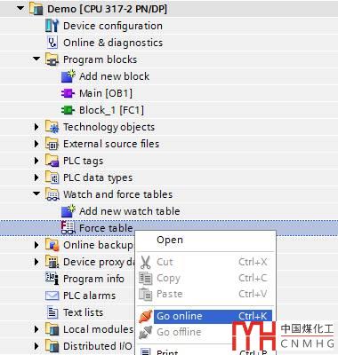 2)使用“強制表(Force table)”,編程電腦(PG/PC)必須與CPU建立連接(Go online);
