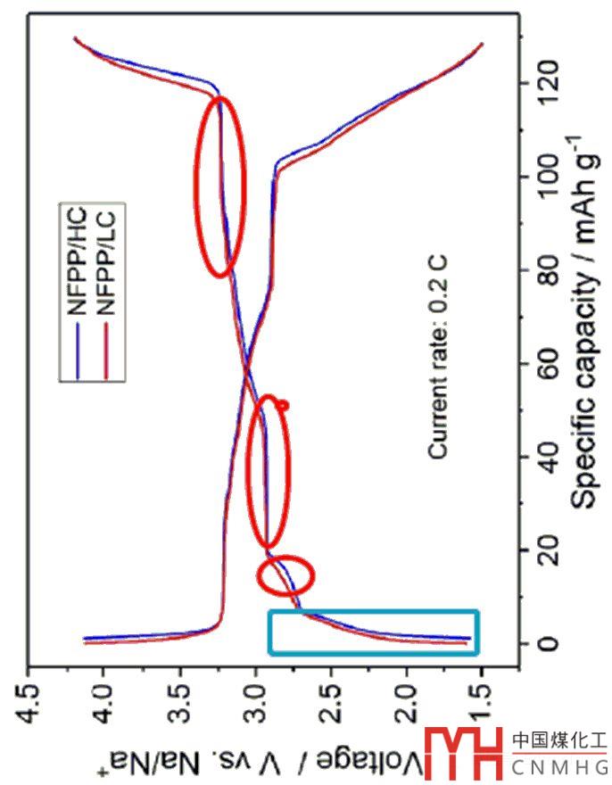 如果是(2),向M不斷灌入電流時(shí),電位也在發(fā)生變化,如果低于平衡電勢(shì),灌入的電流相當(dāng)于直接給了一個(gè)導(dǎo)體正電荷,但它無(wú)法吸納,就會(huì)使得的電位迅速變化,這就是充放電曲線(xiàn)中的類(lèi)似于直線(xiàn)的部分(如圖7中被藍(lán)色框內(nèi)的部分)。但當(dāng)電勢(shì)繼續(xù)升高,接近第一個(gè)平衡電勢(shì),就會(huì)出現(xiàn)正電荷被吸收,導(dǎo)致電壓升高得較慢,如第一個(gè)圈。如果第二個(gè)平衡電勢(shì)處的M特別多,就會(huì)出現(xiàn)給多少正電荷都能吸收(M處于吃正電荷吃不飽的狀態(tài)),就會(huì)使得電勢(shì)基本維持了一個(gè)平臺(tái),而這時(shí)候,還是在向外回路劇烈給電子。