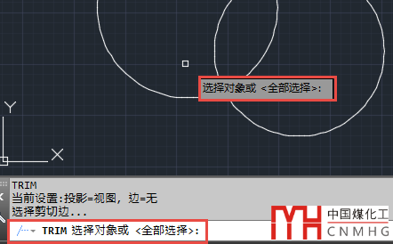命令執(zhí)行后首先讓我們選擇作為修剪邊界的線,選擇邊界線有兩種方式,一種是直接選擇對象,一種是全部選擇(也就是用所有對象作為修剪對象)。選擇對象是CAD軟件設(shè)定的當(dāng)前選項,可以直接操作,選擇圖形作為修剪邊界。全部選擇是第二選擇,但作為默認(rèn)選項,回車就可以執(zhí)行。