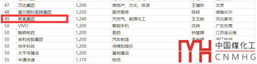 新奧集團成功入圍TOP50,以1240億元位列第49位,力壓VIVO、吉利、快手和中通快遞等著名民企。