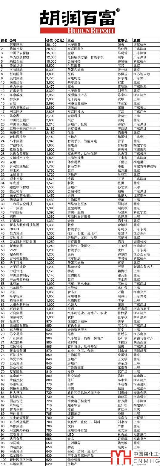 傳統能源僅新奧、廣匯上榜!2019胡潤中國民企500強放榜