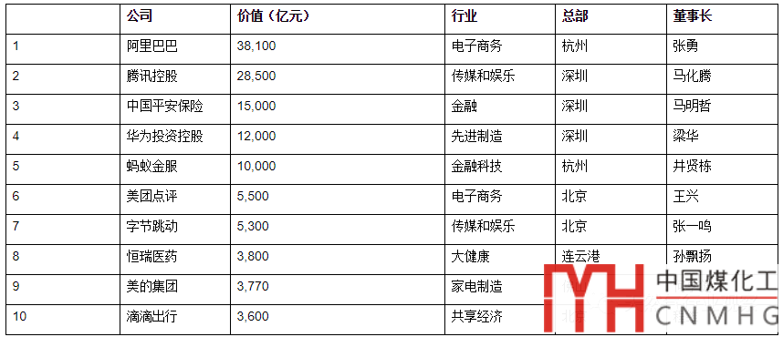 阿里巴巴、騰訊和平安保險以3.8萬億、2.9萬億和1.5萬億市值成為中國前三最值錢民企,華為以1.2萬億估值位列第四,螞蟻金服以1萬億市值位列第五。