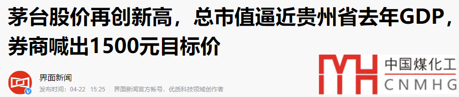 不過(guò),貴州還有國(guó)酒茅臺(tái),茅臺(tái)剛剛再創(chuàng)新高,4月22日午盤后股價(jià)創(chuàng)下1249.50元/股的歷史新高,總市值達(dá)1.56萬(wàn)億元,超過(guò)貴州省2018年1.48萬(wàn)億的GDP,相當(dāng)于貴州省2019年GDP的93%。